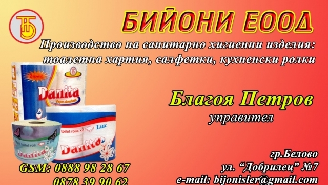 Бийони ЕООД е производител на тоалетна хартия, салфетки, медицинска вата и др. с търговската марка Данита. Производствената база, заедно с административна част се намира в гр.Белово.