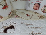 Предлагаме: спални комплекти, бебешка възглавничка визитка, комплекти за колички, обиколник за кошара, прощъпулник, бебешка погача, играчки, кърпа/хавлия за кръщене, комплект кърпи за кръщене, всички аксесоари за кръщене, подаръци за гости, покани, подаръци за големи