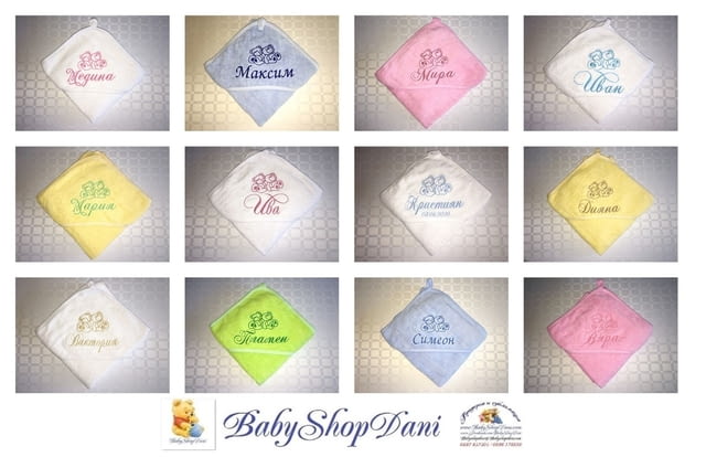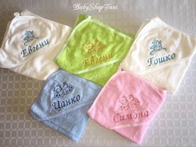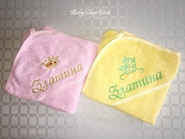 С избор на цвят на бродерия/ИМЕ и хавлията - бяла, розова, синя и жълта