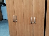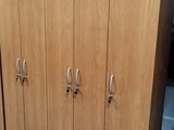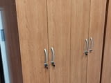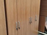 Гардероба е с размер ширина 120см, височина 201см и дълбочина около 45см. Налични са 2бр - с 3 крила. Разпределението за всяко крило е 2рафта и 4 закачалки във всяко гардеробче. Гардеробите са запазени с добре работещ обков панти и ключалки. Цвета е червеникаво кафяв - Череша.