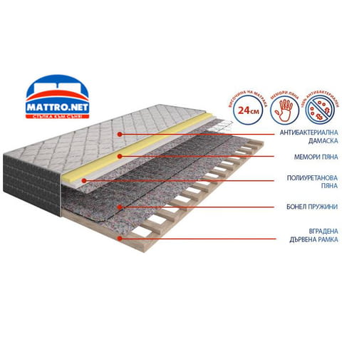 Еднолицев матрак Венера Лукс Мемори е модел, който несъмнено ще направи съня ви много по-спокоен и пълноценен. Горният слой на матрака е изграден от мемори пяна, която спомага за по-меко усещане по време на сън и перфектно следва извивките на цялото тяло. Под нея е разположен още един слой - висококачествена полиуретанова пяна, която от своя страна допринася за правилна позиция на тялото. Основната част на еднолицевия матрак е изградена от познатите бонел пружини, които са издръжливи на натоварване. Всички тези материали са обвити в красив калъф, преминал задължителна антибактериална и антиалергична обработка. Еднолицев матрак Венера Лукс Мемори на матраци Mattro е с вградена ламелна подматрачна рамка, което го прави напълно подходящ за поставяне на повдигащ механизъм и пълноценно използване на подматрачното пространство. Доверете се на гарантираното качество и добрият сън!
