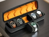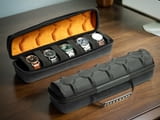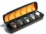 Твърд калъф за съхранение и пренасяне на часовници. До 5 броя ръчни часовника. Има удобна дръжка и цип за затваряне. Черно и оранжево. Снимката е илюстративна, изобразените часовници не са включени в цената на продукта.