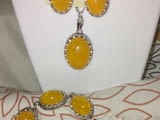 Комплект в 5 части в жълт синтетичен кехлибар и в покритие от сребро. Висящите му обеци са с английско закопчаване. Пръстенът е средна величина.