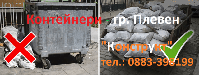 Цени за контейнери Чистота Плевен: 3 куб. – 80 лв, 4 куб – 90 лв, 6 куб – 100 лв, 7 куб – 110 лв. (такса сметище 20 лв./тон за строителни отпадъци и 30 лв. /тон за битови отпадъци)
