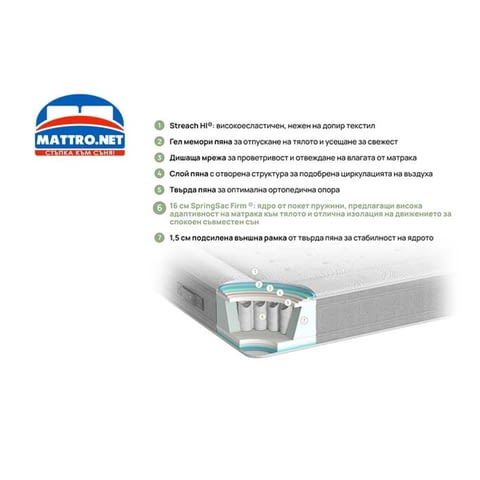 Матраци ISLEEP допълват богатото си портфолио с хибриден модел матрак Nest Hybrid, включващ всичко необходимо за благоприятен сън. Многопластовата структура е съчетание от покет пружини (SpringSac Firm), гел мемори пяна, твърда пяна и Aqua Pur пяна. SpringSac Firm - пружинен покет пакет с 16 см височина е в основата на ядрото. Този тип пружини са индивидуално опаковани, като по този начин отлично се адаптират към натиска от тялото и не предават движенията към останалата част от матрака. От двете страни на пружините са разположени симетрично слоеве от различни по вид пяна - твърда пяна с ортопедични характеристки, над нея Aqua Pur пяна със специфична структура, позволяваща по-висока въздухопроходимост и гел мемори пяна в горната и долната част на ядрото, която подпомага отпускането на тялото чрез адаптиране към формите му и терморегулиращите си свойства. Между гел пяната и слоя Aqua Pur пяна е вложена и дишаща мрежа за допълнителна проветривост, която успешно отвежда влагата от матрака. По края на Nest Hybrid е разположен борд от твърда пяна, който стабилизира цялата конструкция и не позволява деформация на ядрото. За финал цялата структура е обгърната от висококачествен калъф със Streach HI текстил, който е антиалергичен и мек при допир. Посочената цена е за размер 82/190.