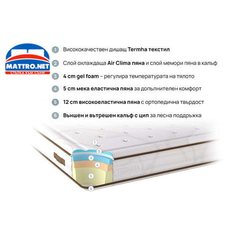 Матрак Supreme е модел, изграден със сърцевина от 3 различни материала, които осигуряват максимално удобство по време на почивка. Моделът разполага със слой ортопедична пяна, която се грижи за правилната позиция и поддържа гръбнака. Към нея е добавена високоеластична пяна, гарантираща стабилна опора. За да подобри комфорта ви по време на сън изцяло, матрак Supreme разполага и с вложена мека охлаждаща гел пяна, която осигурява свежест през цялата нощ и предпазва от изпотяване. Луксозният Termha текстил на матрака, разполага с високо съдържание на вискозни влакна. Калъфът е устойчив на износване, регулира температурата на тялото и предразполага към пълно отпускане. В капитонажа на текстила е добавена мемори пяна, която се нагажда идеално спрямо извивките на тялото. Матракът разполага с външен и вътрешен калъф с цип, които са лесни за почистване, обработени антибактериално и антиакарно.