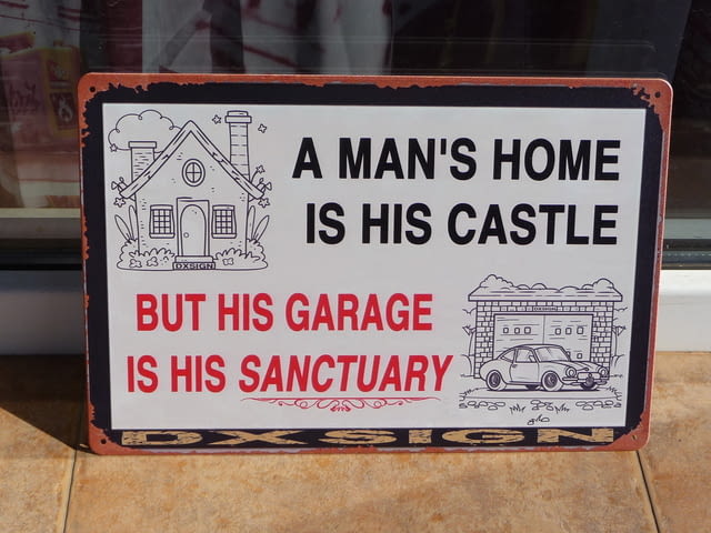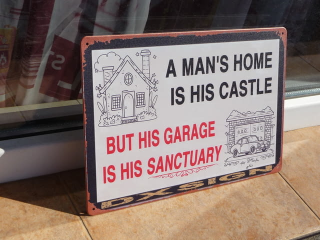 Метална табела За мъжа дома е крепост а гаража е църква светилище