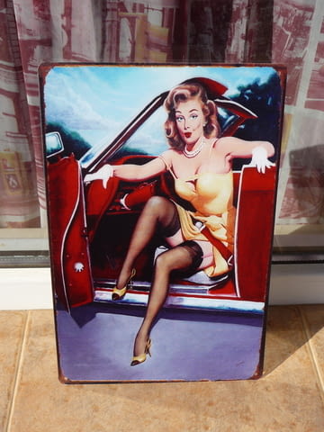 Метална табела кола кабрио мацка с жълта рокля еротика колан