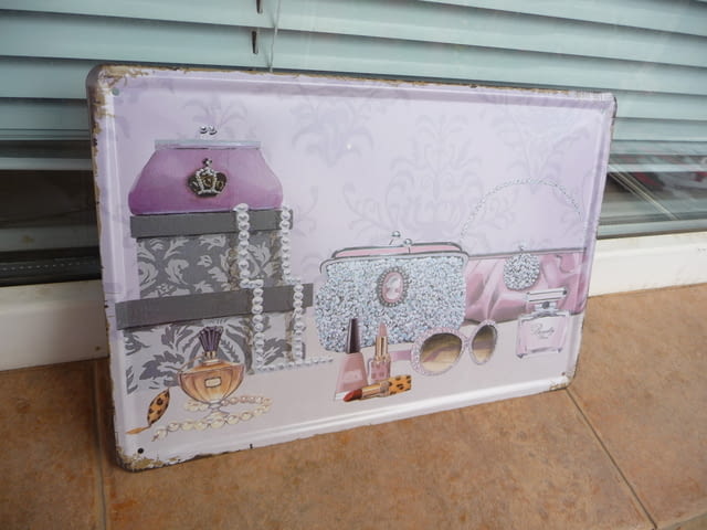 Метална табела мода бижута червило лак слънчеви очила парфюм чанта перли бижута