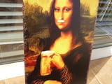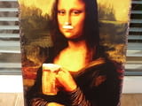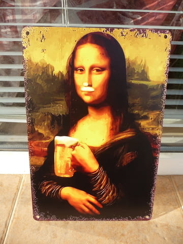Метална табела Мона Лиза с бира в ръка и пяна на носа мустаци шарж