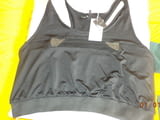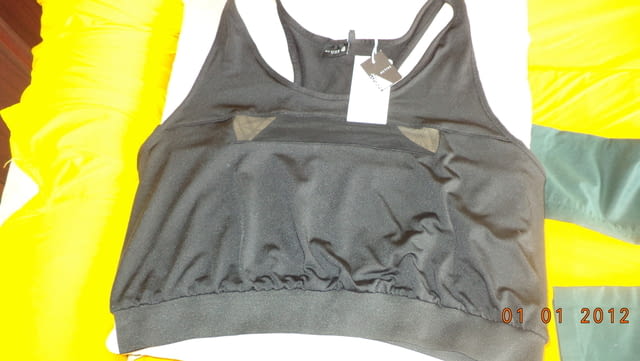Снимки 6 и 7 - Късо черно горнище от еластично трико, със широк ластик под бюста, с тюлен прозорец на бюста и тънки презрамки, размер ХХЛ, цена 5 лв