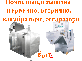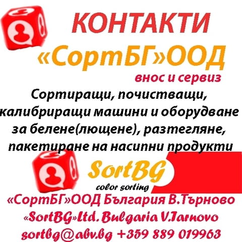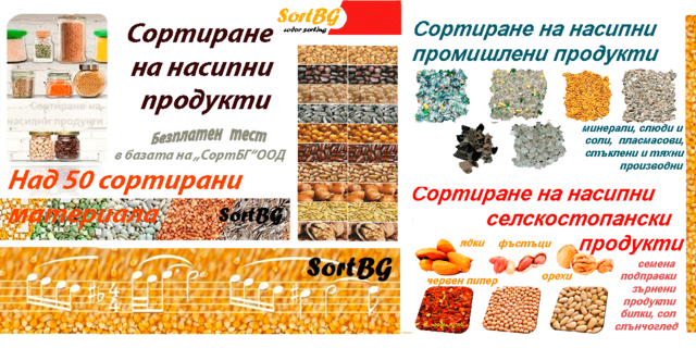 СортБГ ООД предлага сортираща, почистваща и калибрираща техника, както за първично почистване, така и за последваща обработка и финално почистване на насипни продукти . Coртираме минерали, слюди и соли, насипни, пласмасови, стъклени и тяхни производни, както и други насипни промишлени продукти , всички селскостопански култури, семена, пшеница, овес, ечемик, царевица, коноп, фасул, нахут, грах, ориз, елда, леща, кореандър, просо, горчица, лен, коноп, шарен, чер, бял, слънчоглед, белен слънчоглед, тиквени семки, ядки, орехи, лешници, бадеми, соя, сушени гъби, чесън, лук, билки, подправки, чер, червен пипер, сол, маслини, картофено пюре и т.н. Предлага фотосепаратори с различно предназначение за сортиране на трудно отделими примеси по визуални признаци, такива като : цвят, форма, текстура . Използването на фотосепаратор позволява да се получи еднакво, чист продукт от 99.9%, отличаващ се с високи потребителски качества. Предлагаме, техника за първично почистване, за последваща обработка, оборудване за пакетиране, фотoсепаратори CSort с капацитет от 50 до 42000 кг/ч. Предлагаме промишлени кантари, теглови дозатори и теглилки за всички отрасли и промишлености. Предлагаме проектиране и изграждане на линии и комплекси за почистване, калибриране, сортиране и пакетиране на насипни продукти.