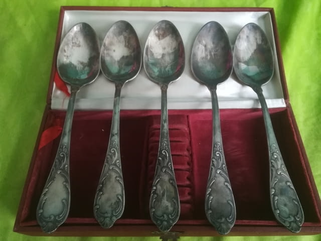 Продавам комплект стари лъжици с орнаменти по дръжките поставени в кутия