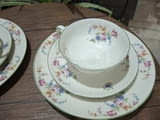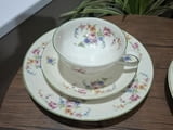 Тройни сетове Edelstein Bavaria. Вместимост на чашата 180 мил. диаметър в горната част 10 см. височина 5 см. Подложна чиния диаметър 15 см. и десертна чиния 20 см. диаметър. Цена за троен сет 15 евро . Налични 7 бр.