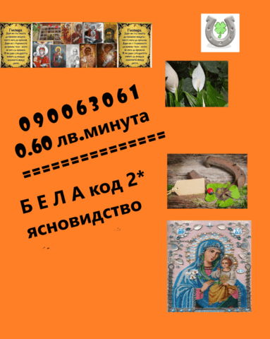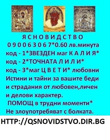 О9ОО63О67 код 3***ФЕНОМЕНАЛНАТА Ц В Е Т И 100 % ЯСНОВИДСТВО, без лъжи и измами ! БЕЗ УГОВОРКИ за такси заплащате само разговорът *И С Т И Н А Т А в този момент е важна за вас.Маг Ц В Е Т И е с ВРОДЕНА ДАРБА в помощ на хората в беда и с житейски проблеми. С много силна сензитивност , усеща замърсеното биополе на човека с който разговаря и НАЛИЧИЕ НА ЧУЖДО ВМЕШАТЕЛСТВО. П Р О В Е Р К А за м а г и я *** съвети за р а з в а л я н е и и защита с БОЖЕСТВЕНА НАМЕСА . ПОТЪРСЕТЕ ме по ВСЯКО ВРЕМЕ , ПСИХОЛОГИЧЕСКА ПОМОЩ И ПОДКРЕПА , точни отговори на въпроси, ясновидство, астрологични прогнози , таро карти. Кога вашата вибрация е най - силна за промяна. СПОДЕЛЯМ ИЗПИТАНИ РИТУАЛИ за благоденствие , просперитет , хармонични отношения, за подробности ме потърсете на посоченият телефон о9оо63о67 код 3*** и с т и н а т а, понякога боли , но това ще ви спаси от беди и грешки в житейският ви път . бъдете здрави и обичани.***