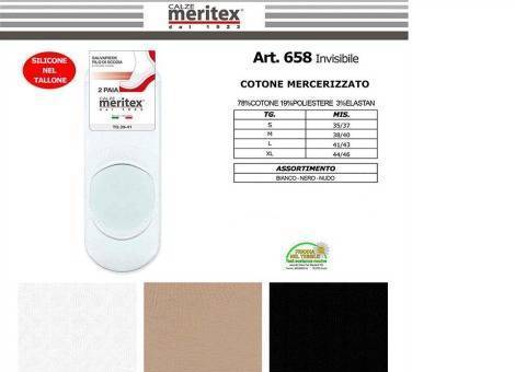 Art 658 памучни терлици унисекс, изработени изцяло от еластичен и мек памук, подходящи и за най-горещото време, напълно невидими под затворени обувки като кецове и/ или маратонки, подходящи както за мъже, така и за жени, ако отговарят на номера, произведени от италианската марка за памучен терлик Меритекс/ Meritex. Продуктът представлява терлици ново поколение благодарение на силиконова лепенка от вътрешната страна на задния край, а терликът не се изхлузва и стои залепен за петата през целия ден.