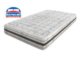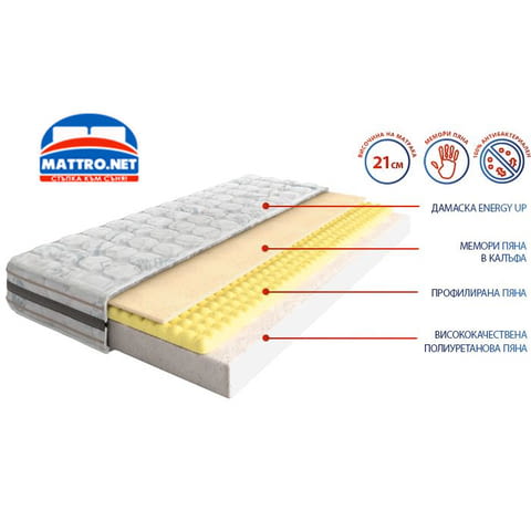 Двулицев матрак Blue Wave Memory е висок 21 сантиметра и e с две различни на усещане страни. Сърцевината на Blue Wave Memory е съчетание от 14 см полиуретанова пяна със силна еластичност и профилиран слой пяна - 4 см. Моделът е с лятна и зимна страна, като от зимната страна е с по-меко усещане. От тази страна калъфът е капитониран с 2 см слой мемори пяна, която е термочувствителен материал. Реагирайки на телесната температура, тя има свойството да възприема извивките на тялото и да предлага по-висок комфорт. Също така задържа топлината на тялото, което я прави подходяща за използване през зимните месеци. От другата страна дамаската е капитонирана с полиуретанова пяна и полиестерна вата, което я прави по-подходяща за летния сезон. Mатрак Blue Wave Memory е с висококачествена дамаска Energy Up. Страничният борд е с капитониран слой полиуретанова пяна, а визията му е впечатляваща, благодарение на декоративните ленти, разположени по цялата обиколка на матрака. Специалната антиакарна обработка на текстила предотвратява риска от раздразнения по кожата и прави средата на сън безопасна и свежа. Посочената цена е за размер 72/190см.