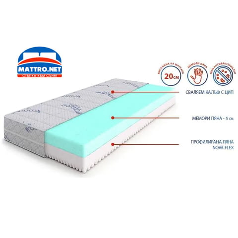 Матракът ще изпълни желанията най-вече на всички онези, които предпочитате матраци без пружини. Моделът - Lavender Memory, ще ви осигури две напълно различни усещания, защото има две различни по твърдост страни. Разположената едностранно Memory пяна (5 см) се адаптира спрямо контурите на вашето тяло и поддържа подходяща за сън температура. Този луксозен материал, неслучайно е толкова предпочитан, тъй като дава усещане за съвършен релакс и сън без напрежение. Другият материал, използван в този уникален модел, е комфортна, профилирана Nova Flex пяна, която се отличава с перфектни характеристики, що се отнася до правилното позициониране на гръбначния стълб. Този вид пяна несъмнено е отлична опора за тялото и осигурява здравословен и приятен сън.