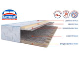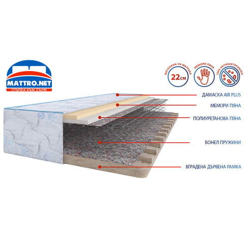 Матракът се състои от класически пакет бонел пружини представляващи стоматизирани закалени чашки навити на спирала, които предразполагат тялото така, че то да заеме най-удобната позиция за сън, а също така поддържат гръбначния стълб в изправена позиция. Горният слой на матрака е изграден от мемори пяна, която ще ви подсигури меко усещане и отлично следване на извивките, на цялото тяло. За да бъде завършен комфорта под мемори пяната е вложен слой от полиуретанова пяна допринасяща за снемане на напрежението и отпускаща мускулите. Цялото ядро на матрака е обвито в красива антиакарна дамаска Air Plus предотвратяваща изпотяването по време на сън и осигуряваща чиста среда. Посочената цена е за размер 72/186 см.