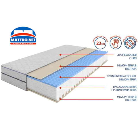 Матрак Maxy Memory Gel е българско производство на матраци MATTRO. Ядрото е от високоеластична пяна, осигуряваща отлична опора и правилна позиция на тялото. Притежава две страни с различно усещане. И от двете страни е поставена по 1 см мемори пяна в прошивката на калъфа за омекотяване и приятно усещане при допир. Само от едната страна е поставен 3 см пласт Cool Gel мемори пяна, който осигурява охлаждащ ефект и предотвратява прекомерното изпотяване. Това прави тази страна на матрака много подходяща за горещите летни нощи. Cool Gel пяната е профилирана, с което спомага за постигане на лек масажиращ ефект. Голямо предимство на този модел е, че е изработен изцяло без лепила, което го прави много добър избор за хора, страдащи от алергии. Калъфът е от висококачествена дамаска, нежна при допир. Поставен е цип за лесна поддръжка и отлична хигиена. Обработен е антибактериално и антиакарно, предотвратявайки развитието на нежелани микроорганизми. Височината е 23 см.