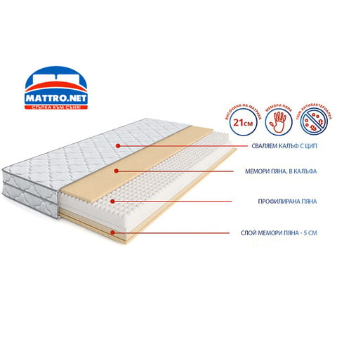Висококачественият матрак е единствен по рода си благодарение на иновативното ядро, което е заложено в него. Матрака е изграден изцяло от непружинно ядро съставено от различни по плътност пяни. От едната страна на ядрото е заложен слой профилирана пяна, която осигурява подкрепа на тялото, там където има най-голяма нужда и придава нежно усещане за релаксиращ масаж. Веднага след този слой е заложена високоеластична пяна от 6 см. с висока плътност, която придава по голяма стабилност на матрака.