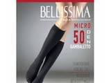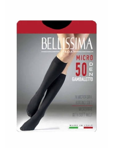 Bellissima Micro 50 гладки непрозрачни и еластични три четвърти чорапи с плътност 50 DEN, изработени от италианската марка за плътни чорапи Bellissima / Белисима. Продуктът представлява кадифени плътни чорапи до коляното, изработени от мек и еластичен микрофибър; мек удобен ластик; невидими пръсти. Цената е за 1 чифт - 2 бр. чорапи.
