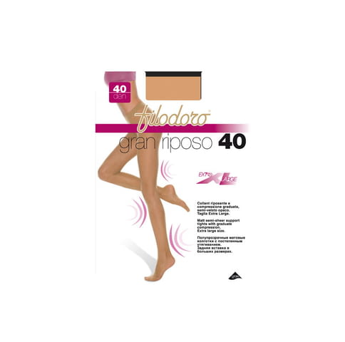 Filodoro Gran Riposo 40 гладък стягащ чорапогащник с плътност 40 DEN, полупрозрачен и матов с масажираща и оформяща компресия, произведен от италианската марка за луксозни чорапогащници Filodoro / Филодоро. Чорапогащникът завършва с плътна горна част (ограничител) с екстра широк ластик на талията за максимално удобство и комфорт; уплътнени пръсти; размери 5-XL и 6-XXL имат допълнително парче на задните части, което позволява допълнително разширяване. Подходящ за дами, които стоят дълго време изправени и-или имат разширени вени. Цената е за 1 бр.