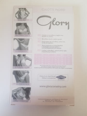 Glory Ingrid безшевни боксерки с нормална талия, които са едновременно с това безшевни с лазерно изрязване по краищата около бедрата, произведени от италианската марка за безшевно бельо Glory / Глори, която е част от марките на италианска конгломерат Pompea / Помпеа. Липсата на шевове около бедрата прави този модел изключително удобен и е идеален за тези, които търсят артикул, който е невидим под плътно прилепнали дрехи. На вътрешния етикет на всеки продукт е изписано, че е произведен в Китай / made in P.R.C. Цената е за 1 бр.