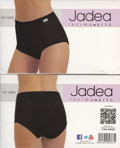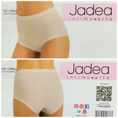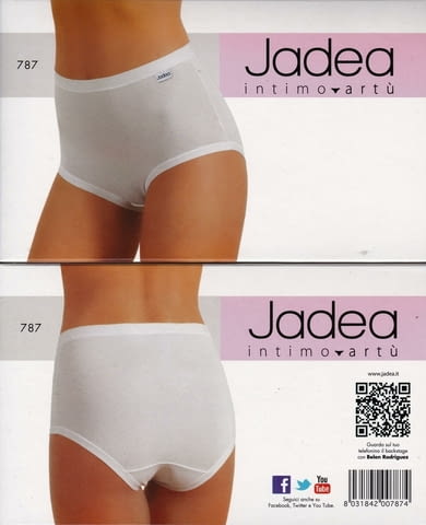Jadea 787 памучни бикини с висока талия, изцяло гладки, изработени от памук и модал, произведени от италианската марка за памучно бельо Jadea/ Жадеа. Подходящи за носене и под най-тънките и прозрачни материи. Препоръчваме модела за носене и от дами с нежна и чувствителна кожа, по време на бременност, тъй като шевовете не са по края, а са скрити и не дразнят кожата. Подходящи за дами с по-широк ханш и-или бедра. Цената е за 1 бр.