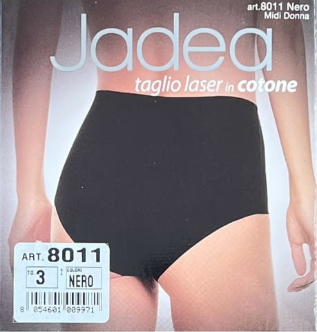 Jadea 8011 безшевни бикини с нормална талия от еластичен памук, чиято материя е лазернорязана по краищата, но същевременно са памучни с мекотата и естественото усещане за кожата, произведени от италианската марка за дамско бельо Жадеа/ Jadea. Благодарение на лазерното рязане на слиповете, са идеални за носене под плътно прилепнали дрехи за напълно невидим ефект. Тези бикини са от типа midi, които са перфектен избор за минимизиране на коремната област и удължават оптически краката заради изрязването на задните части. На вътрешния етикет на артикул е изписано, че е Произведен в Албания/ Made in Albania. Цената е за 1 бр.