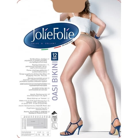 Jolie Folie Oasi bikini 12 изключително тънък и гладък чорапогащник с плътност 12 DEN, с избродирана високо изрязана бикини горна част и с ефект, придаващ лек тен; произведен от италианската марка за дамски чорапогащници Jolie Folie/ Жоли Фоли. Продуктът е подходящ за носене през летните месеци, както и за много официални събития през цялата година; невидими пръсти ( подходящ за носене със сандали/ отворени обувки ); на всяка опаковка е изписано, че е 100% произведен в Италия ( 100% MADE IN ITALY ) с италианско знаме като доказателство за произход. Цената е за 1 бр.
