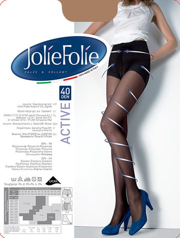 Jolie Folie Active MAXI 40 прозрачен и гладък стягащ чорапогащник с плътност 40 DEN, оформящ силуета благодарение на подсилен ханш, произведен от италианската марка за коригиращи чорапогащи Jolie Folie/ Жоли Фоли. Продуктът представлява възстановяващ чорапогащник, който облекчава краката чрез лек масаж, който е най-съсредоточен в долната част на краката и постепенно намалява към бедрата и завършва с оформящ плътен колан в областта на ханша и талията. Коригиращият чорапогащник е особено подходящ за дами с разширени вени и/или за дами, които стоят изправени продължително време; допълнително парче на задните части, което позволява допълнително разширяване; парче между краката; уплътнени пръсти ( не е подходящ за носене със сандали и/или отворени обувки ); на всяка опаковка е изписано, че е 100% произведен в Италия ( 100% MADE IN ITALY ) с италианско знаме като доказателство за произход. Цената е за 1 бр.