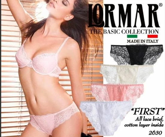 Lormar First бикини с нормална талия, изцяло дантелени в предна и задна част, с вътрешно памучно парче в коремната област, произведени от италианската марка за дамско бельо Lormar ( Лормар ). Цената е за 1 бр.