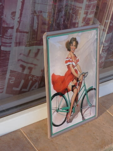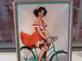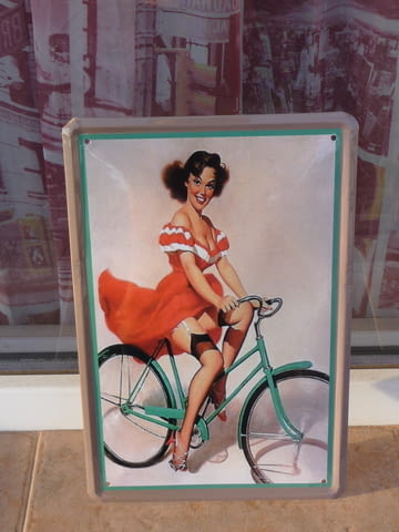Метална табела жена на колело еротика велосипед ретро хубава извито кормило висок ток