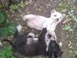 Кученцата са 5 на брой. Родени са на 18.03.2025г. Двете са бели, като едното е късокосместо, а другото - с по-дълга козинка, две са с черно-бяла окраска, като едното е по-пухкаво и с повече бели петна, а другото късокосместо и почти изцяло черно, едно е като меченце с кафяво - бяла окраска. Родителите на малките палета са неголеми на ръст домашни любимци, обезпаразитени, свободно тичащи из голям двор, свикнали с хора.
