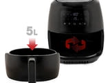 Oбем на купата - 5L Полезен обем – 4.2L (с решетката) Размер на купата: 239x228x97.5 mm Размер на решетката: 226x215 mm Таймер – 60 мин. Автоматични програми за готвене: Пилешко бутче, Пържола, Риба, Десерт, Зеленчуци, Пържени Картофи, Скариди. Регулиране на температурата 80-200℃ Кошница и решетка с незалепващо покритие Автоматично подновяване на готвенето след изваждане на купата. LED дисплей Широк сензорен екран Сигнал за край на готвенето Гумирани крачета против хлъзгане 1500W, 220-240V, 50-60 Hz