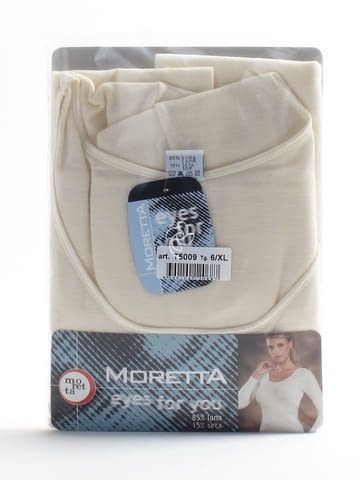 ART. 5009 вълнена блуза с дълъг ръкав, подходяща за носене като долно бельо и (или) под сако и (или) под жилетка, произведена от италианската марка за женско вълнено бельо Moretta.Блузата е изработена от най-висок клас естествени материикато мерино вълна със завършващи сатенени краища около деколтето от марка, произвеждаща висококачествен италиански трикотаж от 1954г. Блузите на марката топлят изключително много, като същевременно седят елегантно по тялото. На вътрешния етикет на всеки продукт е изписано, че е произведен в Италия (made in Italy ) с италианското знаме като доказателство за произход.